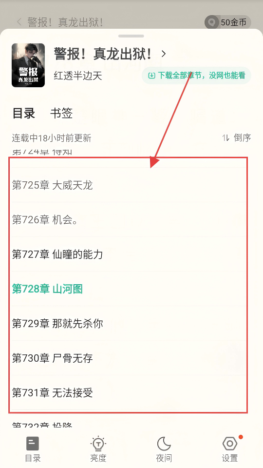 2、在小说阅读页面,点击底部【目录】,就能打开小说目录,超方便查找章节。