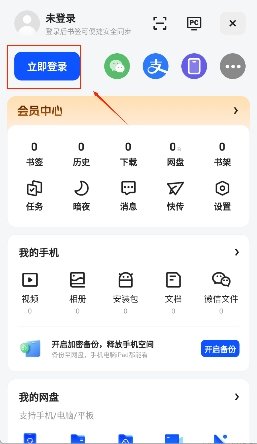 1、要使用完整功能,首先需要登录账号。打开软件后,在首页或网盘页都能看到登录提示,点击蓝色的“立即登录”按钮。