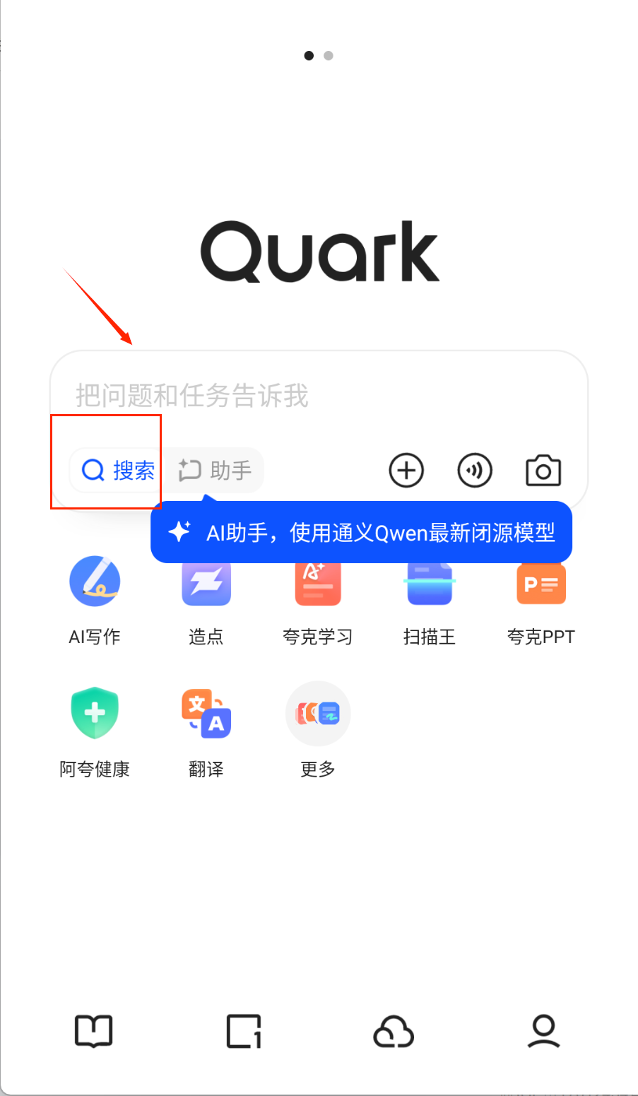 1、打开夸克浏览器,点击右下角的菜单图标。