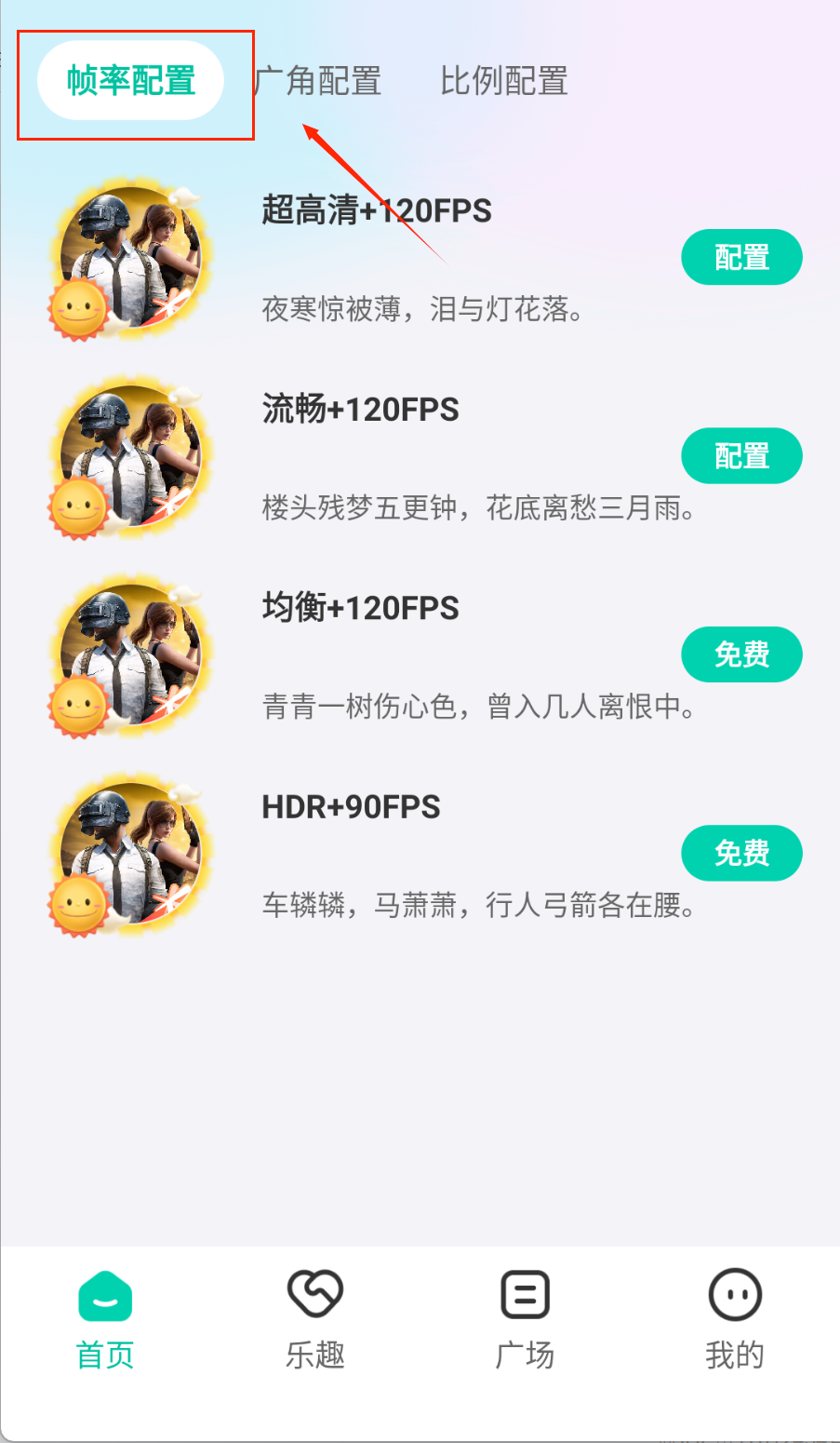 4、“帧率配置”里有些方案附带诗意说明,挺有趣的。但重点还是看“超高清+120FPS”这样的硬指标,结合是否是“免费”提示。