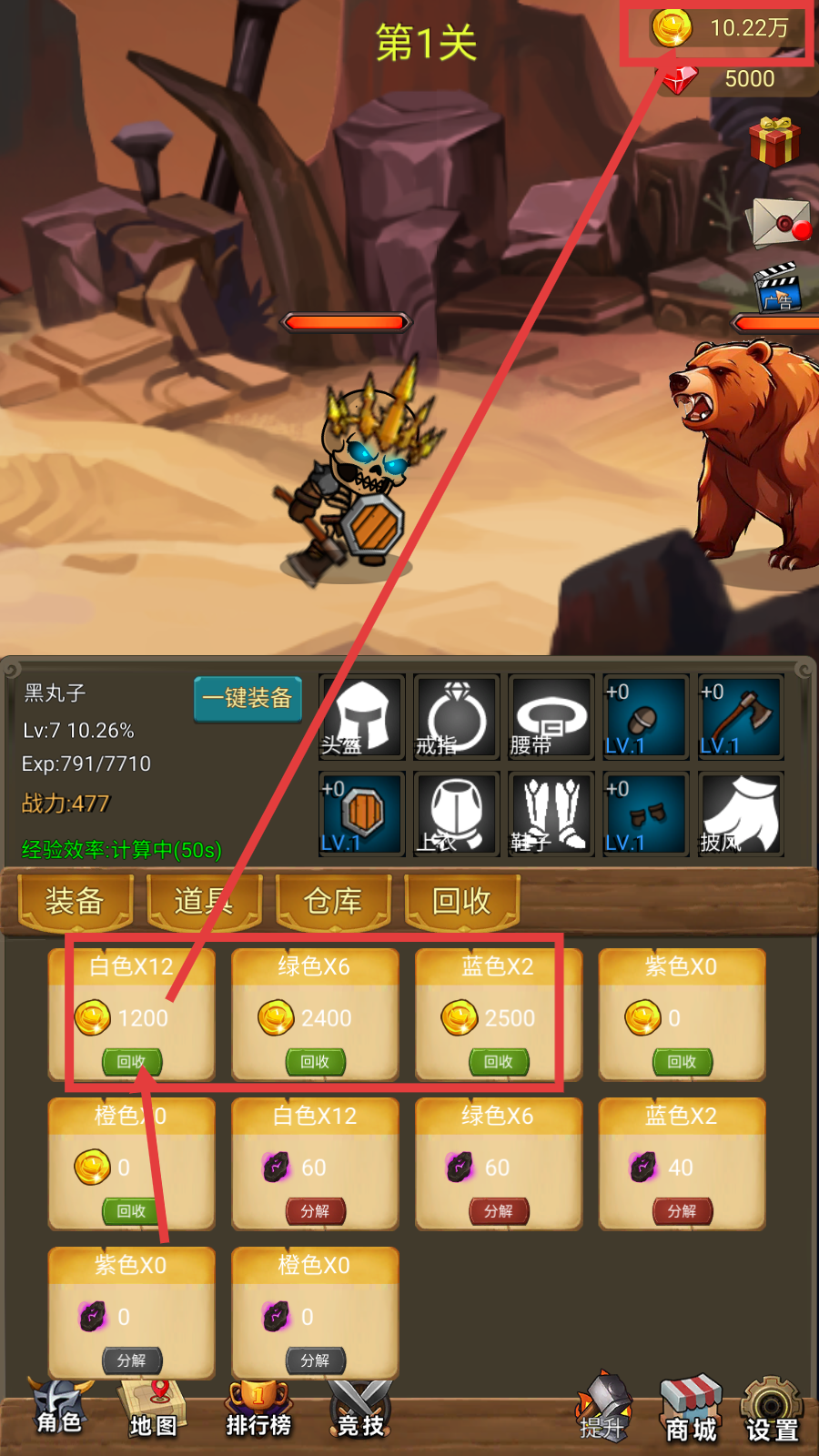 1、回收【白色X12】【绿色X6】【蓝色X2】装备,积累金币至【10.22万】,为后续消费做准备。
