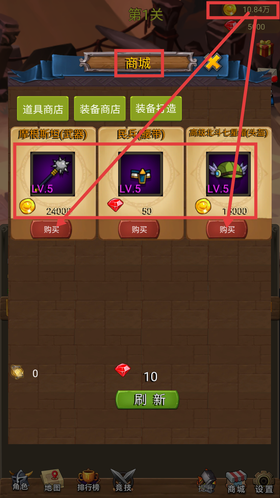 2、进入【商城】,用金币购买【LV.5】装备,如摩根斯坦武器、高级北斗七星帽,提升角色实力。