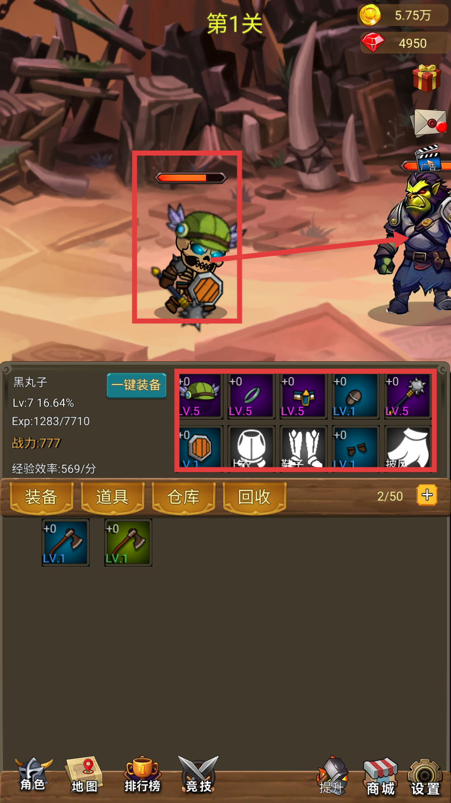 3、更换【LV.5】头盔、武器等装备后,角色战力从477提升至777,高效推进关卡战斗。