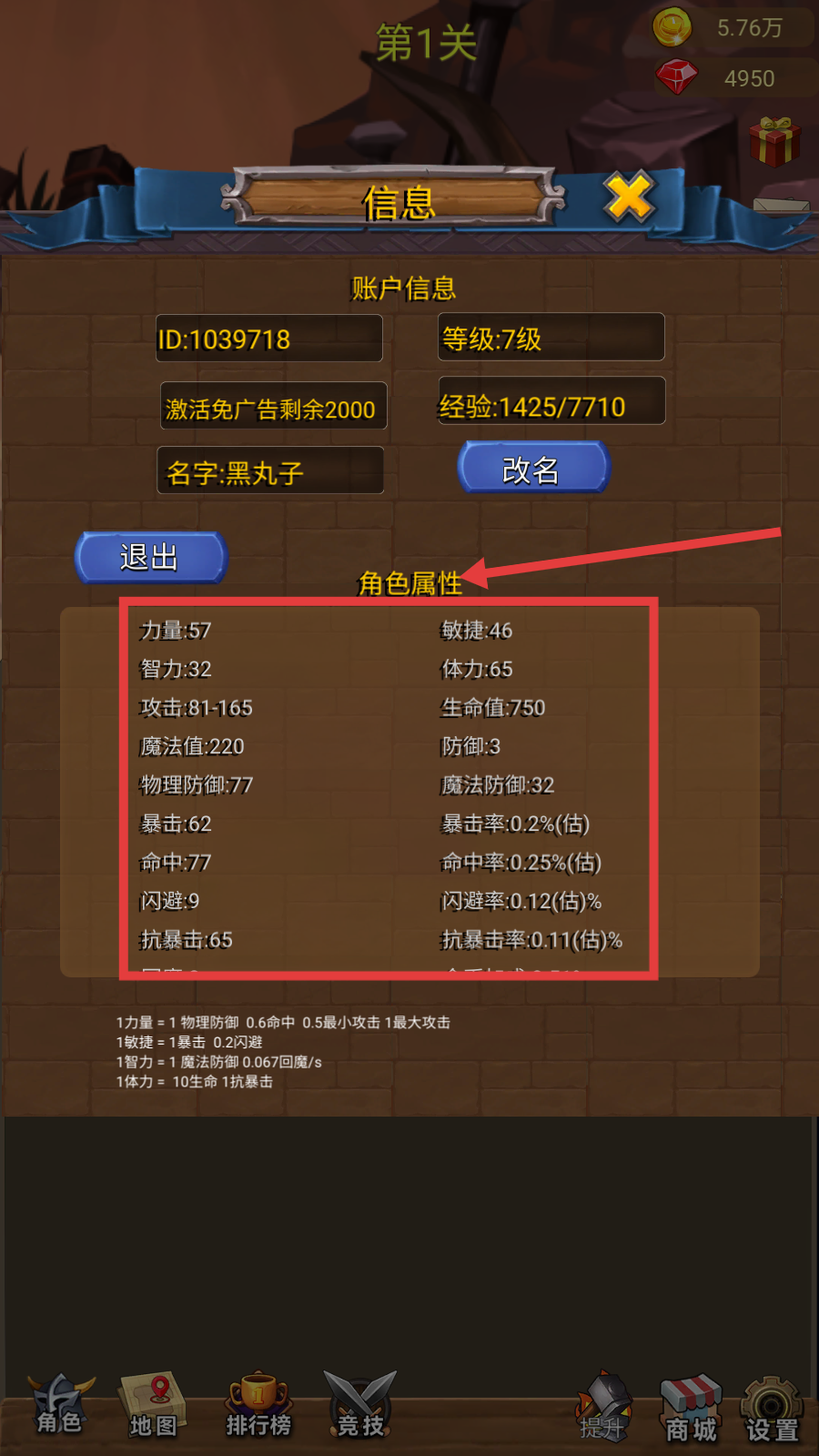 4、打开【信息】界面,查看【角色属性】,了解力量、敏捷等数值,根据属性规划角色发展方向。