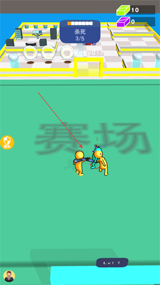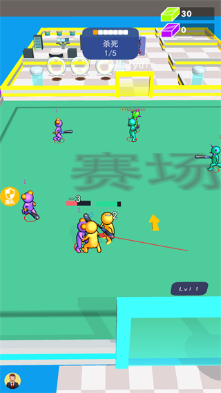 2、在赛场中攻击其他颜色的火柴人,击败一个敌人后完成任务进度1/5,同时注意自身等级。