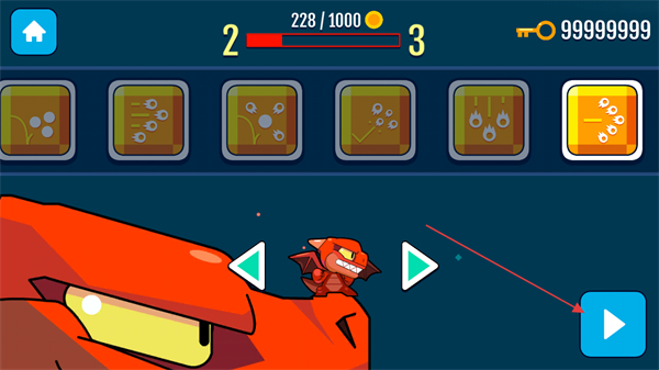 提供多款小飞龙皮肤,从纯色简约款到带装饰的华丽款,均可用无限金币解锁,自定义角色外观,让轰炸恶魔城堡的过程更具个性化。