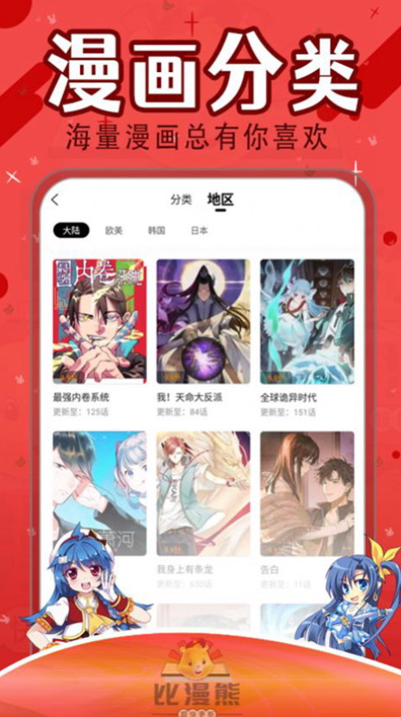 2、分类查询:漫画内容繁多,分类十分详细,无论你是喜欢什么题材的漫画,软件都能为你提供最贴合你口味漫画选项,体验感很出色。