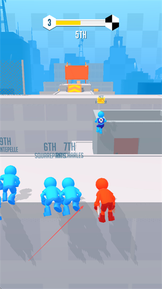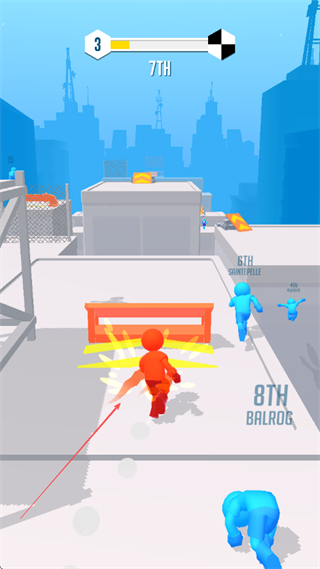 1、操控角色在城市屋顶等场景跑酷,穿过橙色障碍物,超越其他蓝色角色,提升排名。