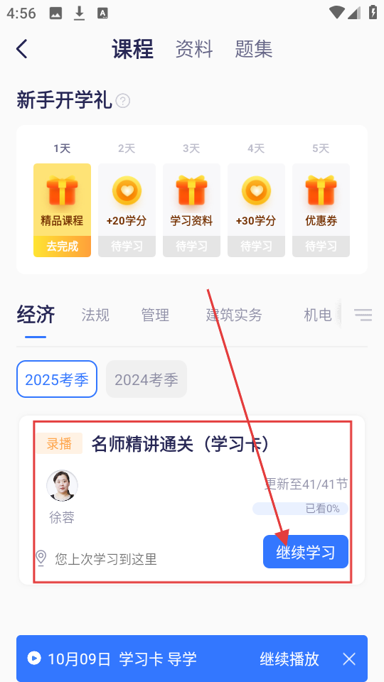 1、在课程页面,找到想学习的课程,比如【名师精讲通关-(学习卡)】,点击【继续学习】,就能进入课程学习啦。