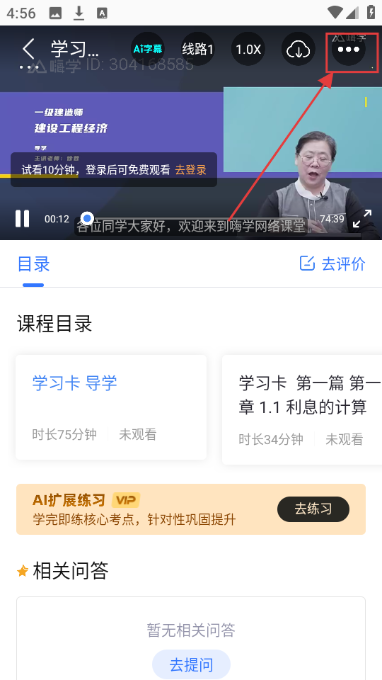2、进入课程学习界面,若想调整播放等设置,点击右上角的【···】按钮,就能调出相关功能选项。
