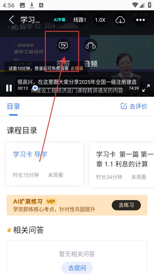 3、在调出的功能选项里,有【投屏】等功能,想把课程投到其他设备,就点击【投屏】按钮。