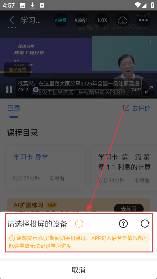 4、点击【投屏】后,会弹出【请选择投屏的设备】提示,选择好对应的投屏设备,就能在更大屏幕上学习啦。
