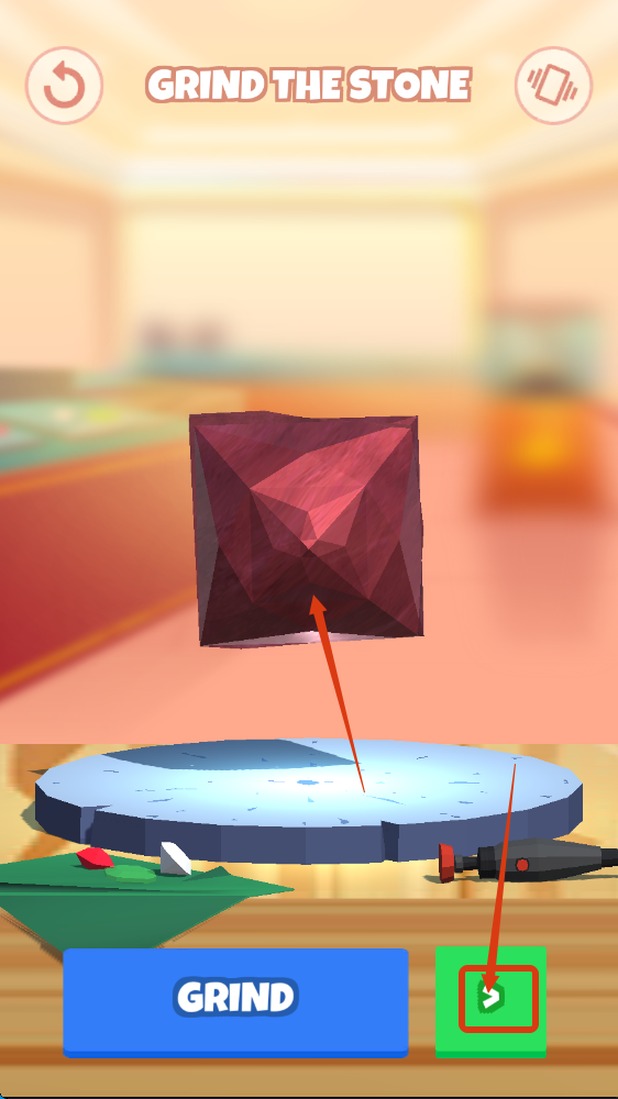 2、在【GRIND-THE-STONE】阶段,点击【GRIND】按钮打磨原石,按照指引塑造宝石雏形,为后续加工做准备。