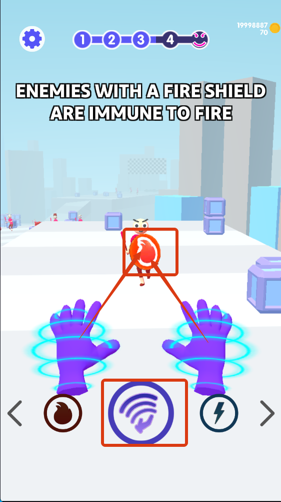 3、遇到带火焰护盾的敌人,切换魔力攻击,因【ENEMIES-WITH-A-FIRE-SHIELD-ARE-IMMUNE-TO-FIRE】,合理选择魔力应对。