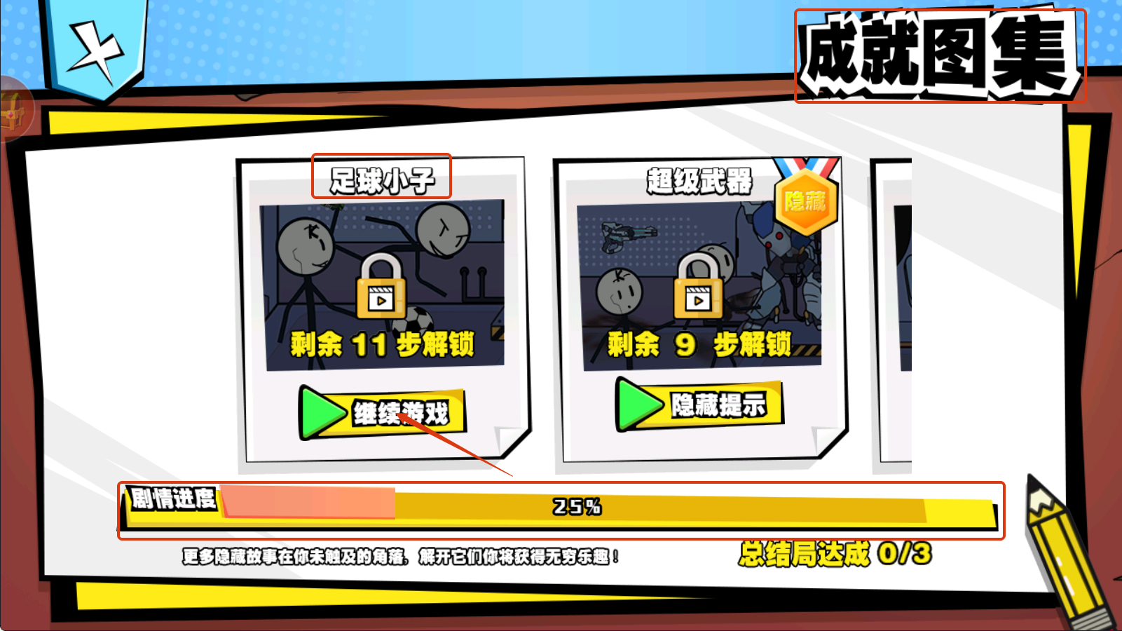 1、在成就图集界面,关注【足球小子】【超级武器】等成就,通过推进剧情(当前25%)解锁,探索隐藏故事可获得更多乐趣。