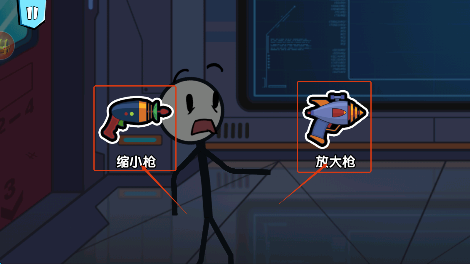 4、面对【缩小枪】和【放大枪】选择时,根据场景需求使用,如缩小或放大物体来解谜或应对敌人,助力关卡推进。