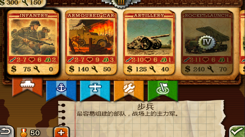 游戏一共拥有6个兵种,分别为步兵、装甲车、大炮、火箭炮、坦克、重坦克。让我们一起熟悉一下这些兵种。