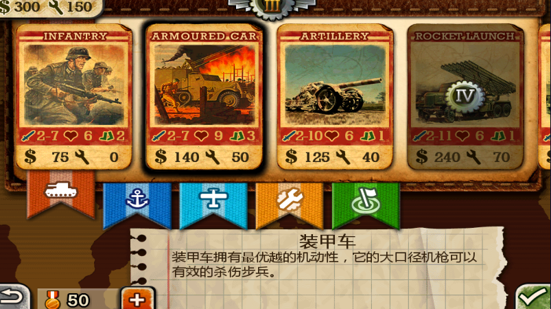 移动能力最强的兵种,每个回合可以移动3次,血量较少为9个。当装甲车血量较少时不要直接放弃,如果打开敌方突破口,使用没血的装甲车直接冲到敌人后方,一顿占点是非常嗨的。另外装甲车是步兵和火箭炮的克星。