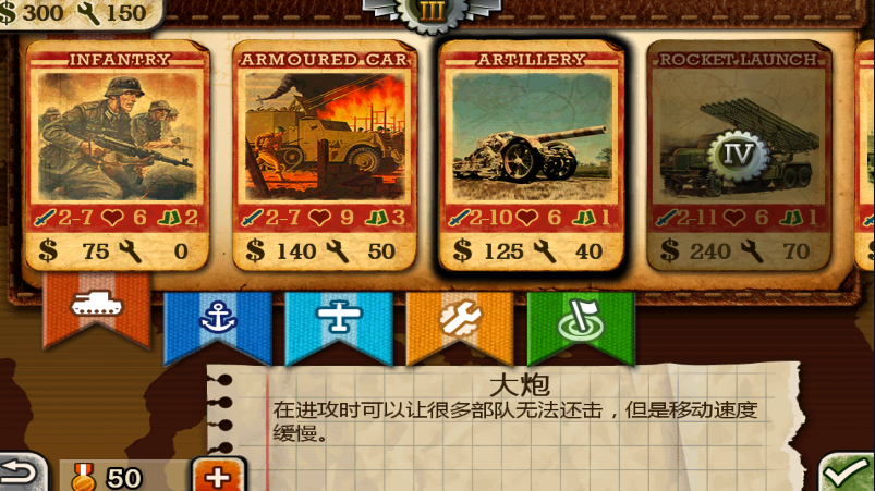 拥有强大的远程火力,在受大炮攻击时可以给与反击。战壕无法阻挡它前进,全歼敌军后,不耗费移动力。
