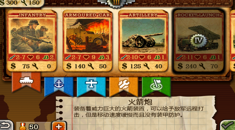 脆弱的超级炮台。火箭炮的攻击力相当强悍,单只能攻击距离2格的敌人。火箭炮的移动能力非常差只有1,并且被攻击没有任何反击能力,如果被敌人近身只能任人宰割。请在使用火箭炮时前面放置坦克、大炮等装备抵御进攻,然后使用火箭炮一顿狂轰。