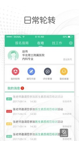 4、轮转管理:为签约基地学员提供移动端全周期管理工具,包含排班查询、日志填写、带教评价等 12 项功能,并配备智能提醒系统,及时提示轮转科室变更及考核节点。