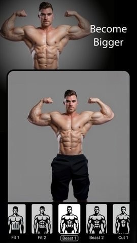 GigaBody 作为一款男女皆可使用的 AI增肌 APP,你只需上传一张健身照片,轻轻点击"一键增强肌肉",等待短短5分钟,就能收获一副堪比健美冠军的完美身材。