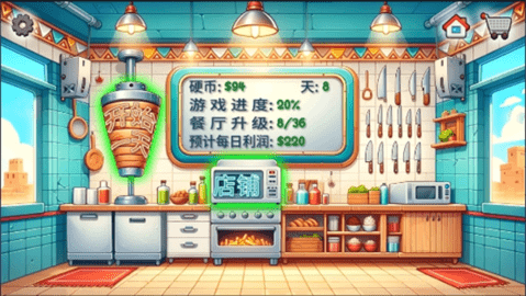 烤盘(一次升顶级,至少升一次):升级需谨慎,操作两行泪,纯纯手动烤煳大怨种,浪费时间,沙威玛烤煳就报废,升一次虽然手动,但不会煳,还能增加预制菜数量。