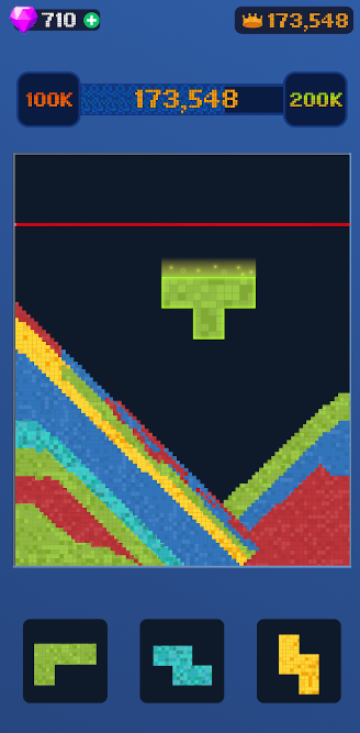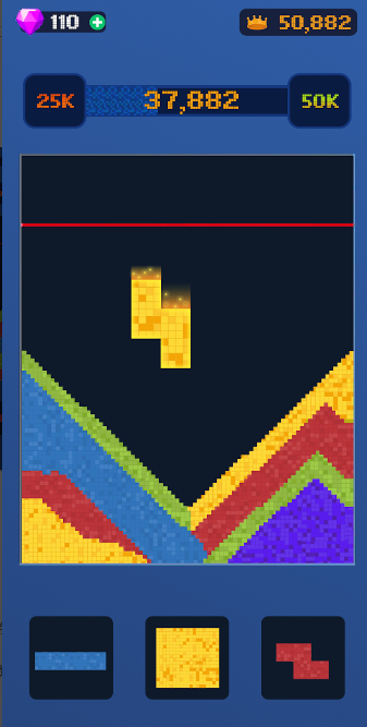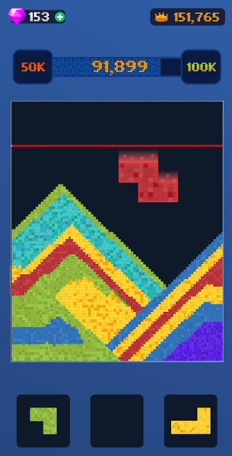 2.看着它们化作五彩缤纷的沙子,自然流动。用相同颜色的方块填满一行即可消除并获得分数。