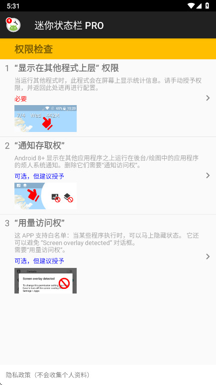 迷你状态栏PRO是一款打破系统原生状态栏限制、提供高度自由定制功能的手机辅助工具,它让你的状态栏不再单调,充满个性。它能够帮助用户自定义手机上原生态的状态栏,能够自由更改状态栏信息的字体大小,能够灵活调整显示内容的颜色和透明度,实现状态栏的视觉美学升级;你可以随心所欲地更改信息显示的顺序,随心所欲地调整状态栏的位置布局,随心所欲地设置个性化的字体样式,打造独一无二的手机界面风格。