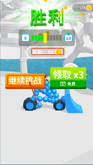 4、胜利后获得【奖励-50金币】,点击【继续挑战】按钮,开启下一轮冒险。