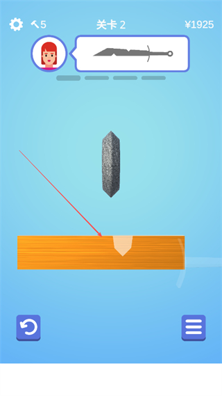 1、在关卡2中,根据上方剑的形状提示,操控砂轮对准橙色木块的缺口,开始打磨塑形。
