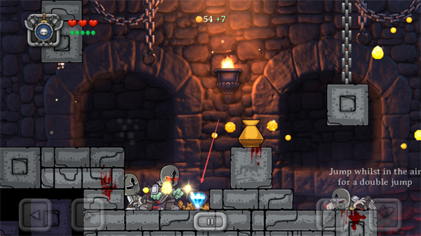 3、利用跳跃和双击跳跃功能,跨越障碍,攻击高处敌人,收集金币和道具。