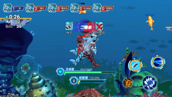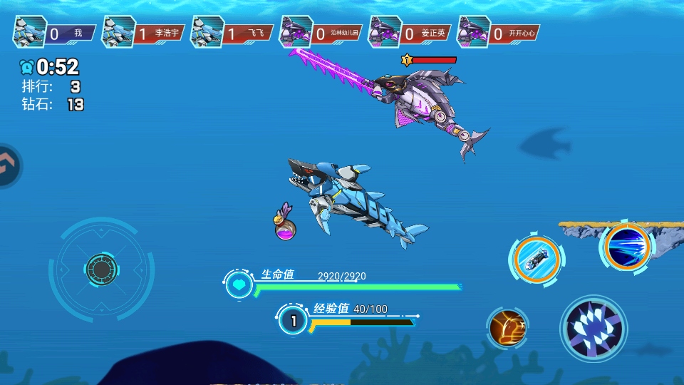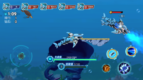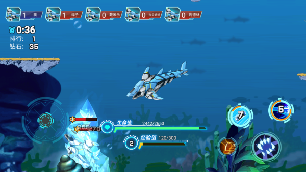 2.使用左侧摇杆控制机械鲨鱼的行动,右侧的技能拥有冷却时间,玩家需要合理释放。