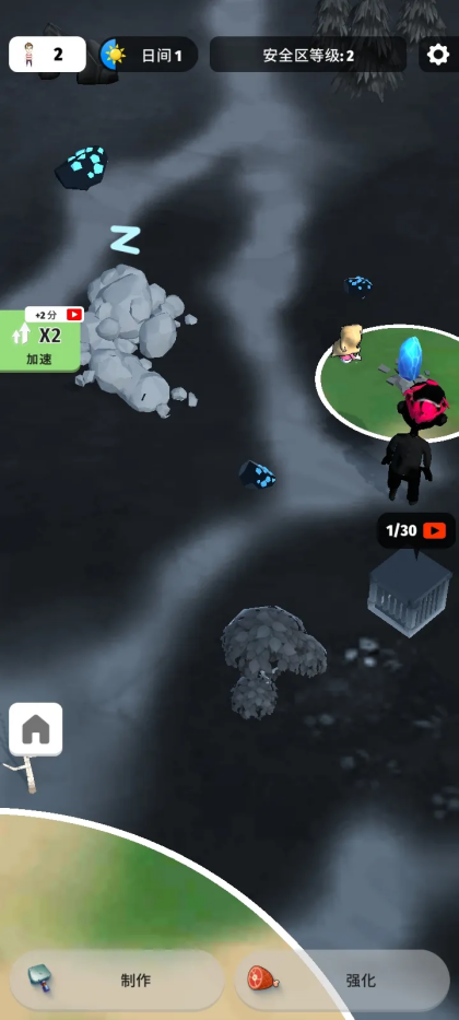 2.随着安全区等级提升(如从1级升至2级),可探索更广阔的区域,收集稀有资源(如带蓝光的石块),同时利用“加速”功能(如X2加速)缩短资源收集和升级时间,提升生存效率。
