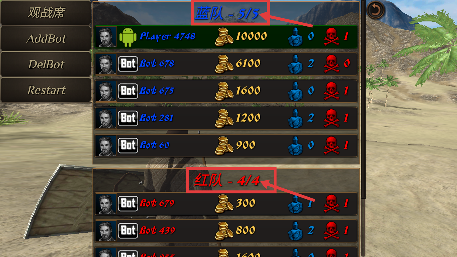 2、查看【蓝队-5/5】和【红队-4/4】的队伍配置,了解成员资源与状态,为对战制定策略。