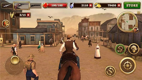 1、用左侧摇杆操控牛仔在西部小镇移动,熟悉场景,准备完成任务。
