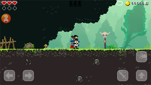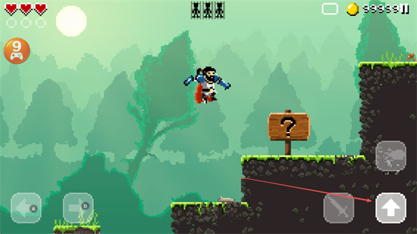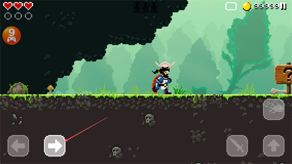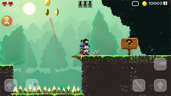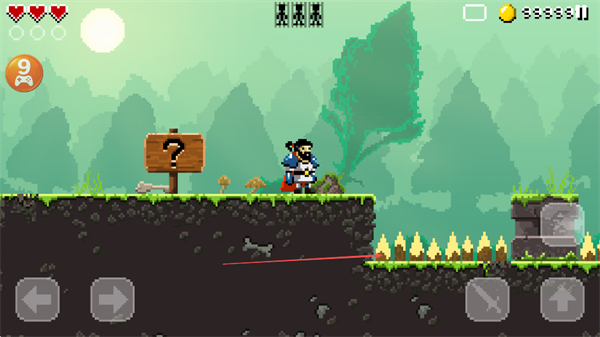1、操控勇士在像素场景中移动,通过左右按键行走,探索森林地形,收集金币。
