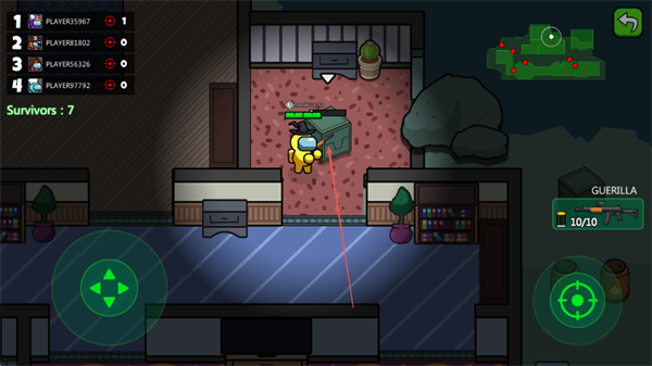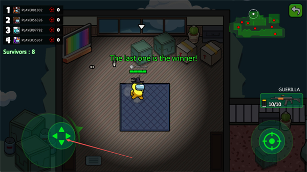 1、用左侧摇杆操控黄色角色移动,在房间内探索,收集武器,目标成为最后存活者。