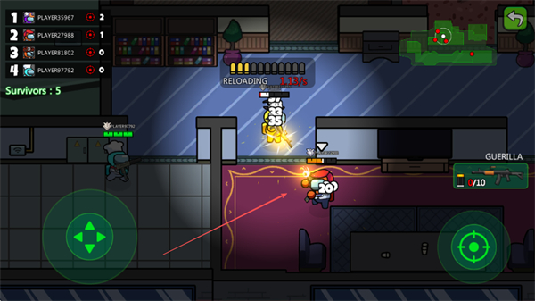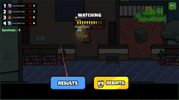 3、使用武器攻击红色角色,注意换弹时间,消灭敌人提升排名,减少存活人数。