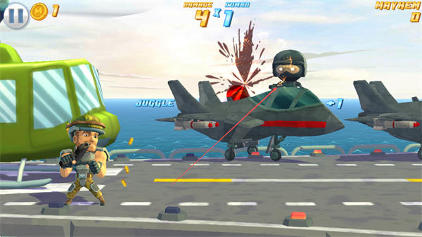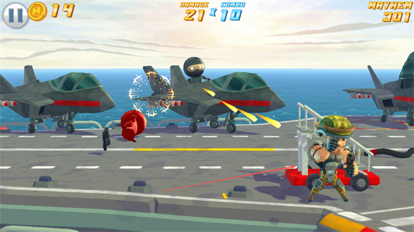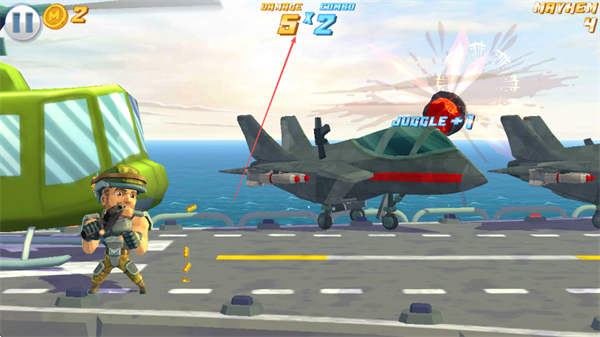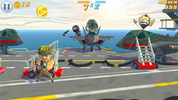 1、在航母场景中,操控角色射击敌方战机,命中后触发爆炸,积累伤害值和金币。