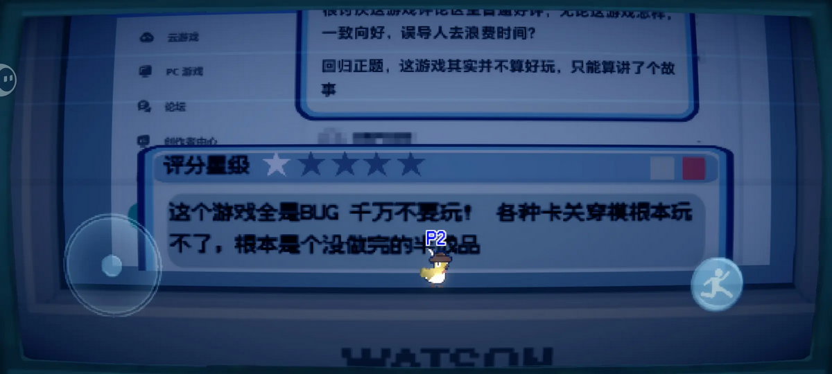 为这充满BUG的游戏送上差评是一款充满荒诞幽默和自嘲精神的反向游戏,在这款游戏中,你将面对无处不在的BUG,每当你认为自己掌握了局面时,系统就会以一种极富创意的方式“捉弄”你。角色可能在正常跑动时消失,跳跃时被送进无底深渊,甚至NPC们会不停地重复同一句话,令你无奈又可笑。游戏的目标并不是顺利通关,而是要在这种“半成品”的环境中,保持足够的耐心和幽默感,笑对挑战。