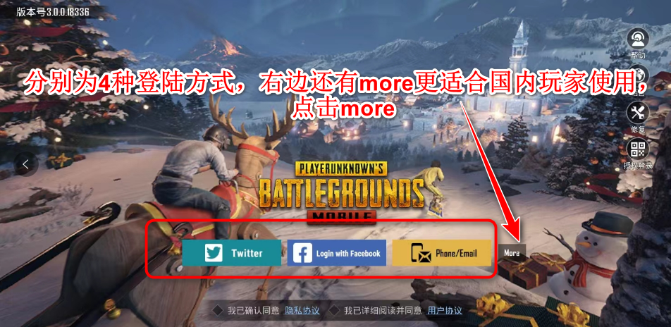 1.在蜻蜓手游网下载完最新的和平精英国际服之后进入游戏,分别为4种登陆方式,右边还有more更适合国内玩家使用,点击more