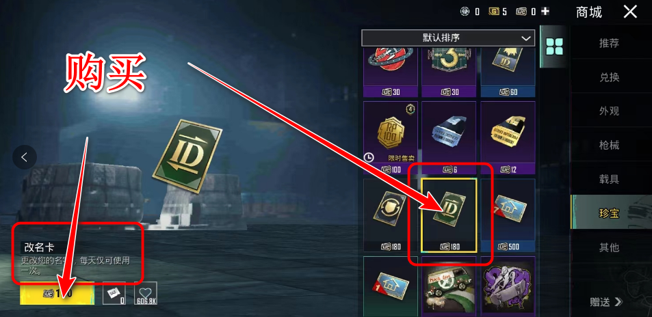 3.向下翻页,找到改名卡进行购买,购买后你就可以改名了