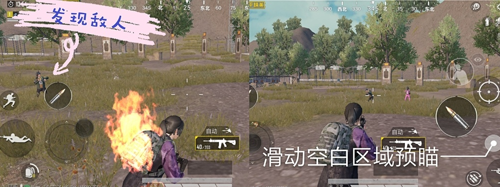例如,你突然感觉到右边房区外有个小黑点在移动,于是打开4倍镜往右滑,当你滑到房区,人却已经消失了。这时你只能猜测敌人在你开镜的这段时间内干了什么,不仅失去了先机,还会因为思考分散注意力。如果先用腰射准星去瞄准敌人,这样视野开阔,能掌握敌人一举一动,并且同样开镜就是人。