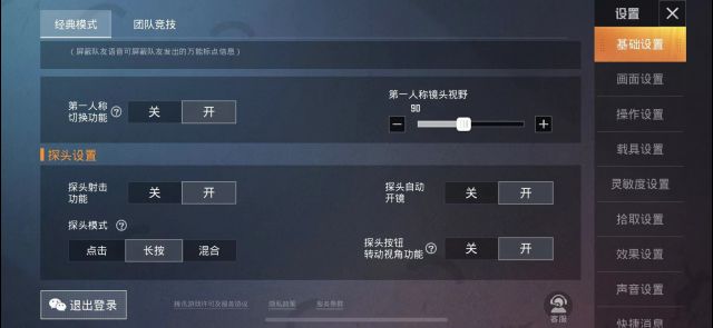 基础设置:点击开镜,开镜可转动视角,点击探头,探头可转动视角。二指不太能用上长按功能。辅助瞄准开。