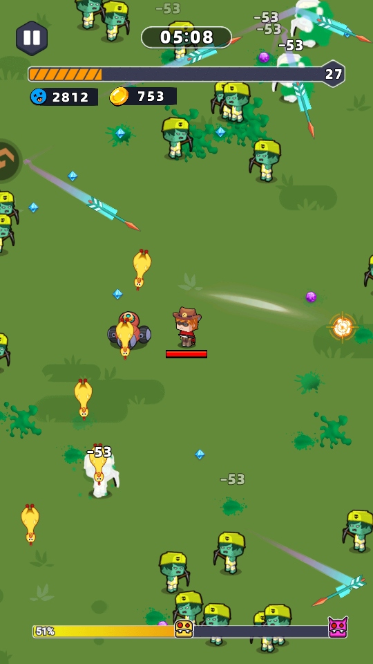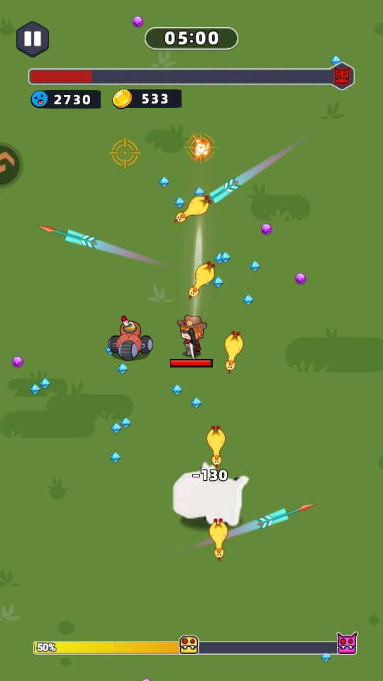 2、指尖移动控制角色进行移动,拾取经验,打败敌人。