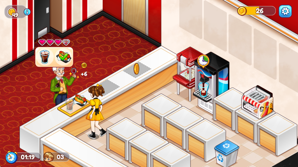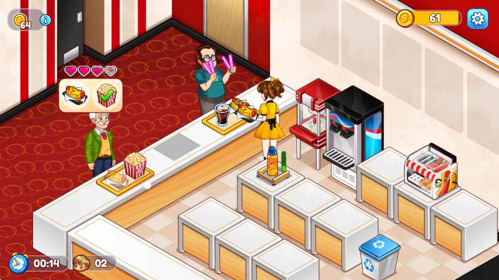 电影院恐慌3是一款融合时间管理、烹饪模拟与影院经营的趣味休闲策略游戏,玩家将学习制作世界各地影院的小吃——从经典的爆米花、汉堡、薯条,到各种甜品和饮料,每种小吃都需要精心制作,满足不同顾客的需求。随着客流量的增加,餐厅和影院设施的升级变得至关重要。你可以改善厨房设备,提升服务质量,甚至升级影院的座位和音响效果,打造出最佳的观影环境。