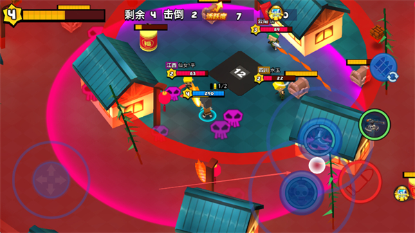 3、在缩圈区域内与其他玩家对战,灵活走位,利用技能和道具消灭对手。