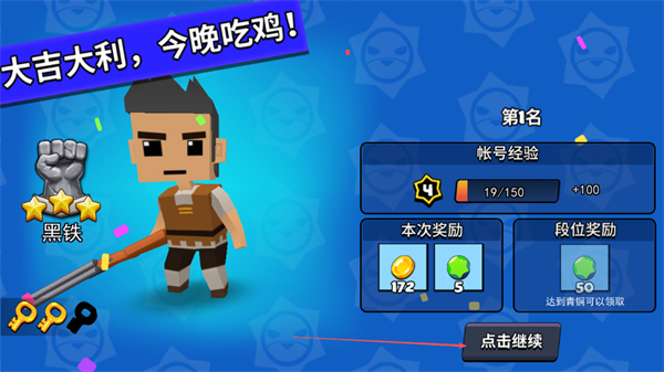 4、获得第1名后,领取帐号经验、金币、绿宝石等奖励,点击继续,继续游戏。