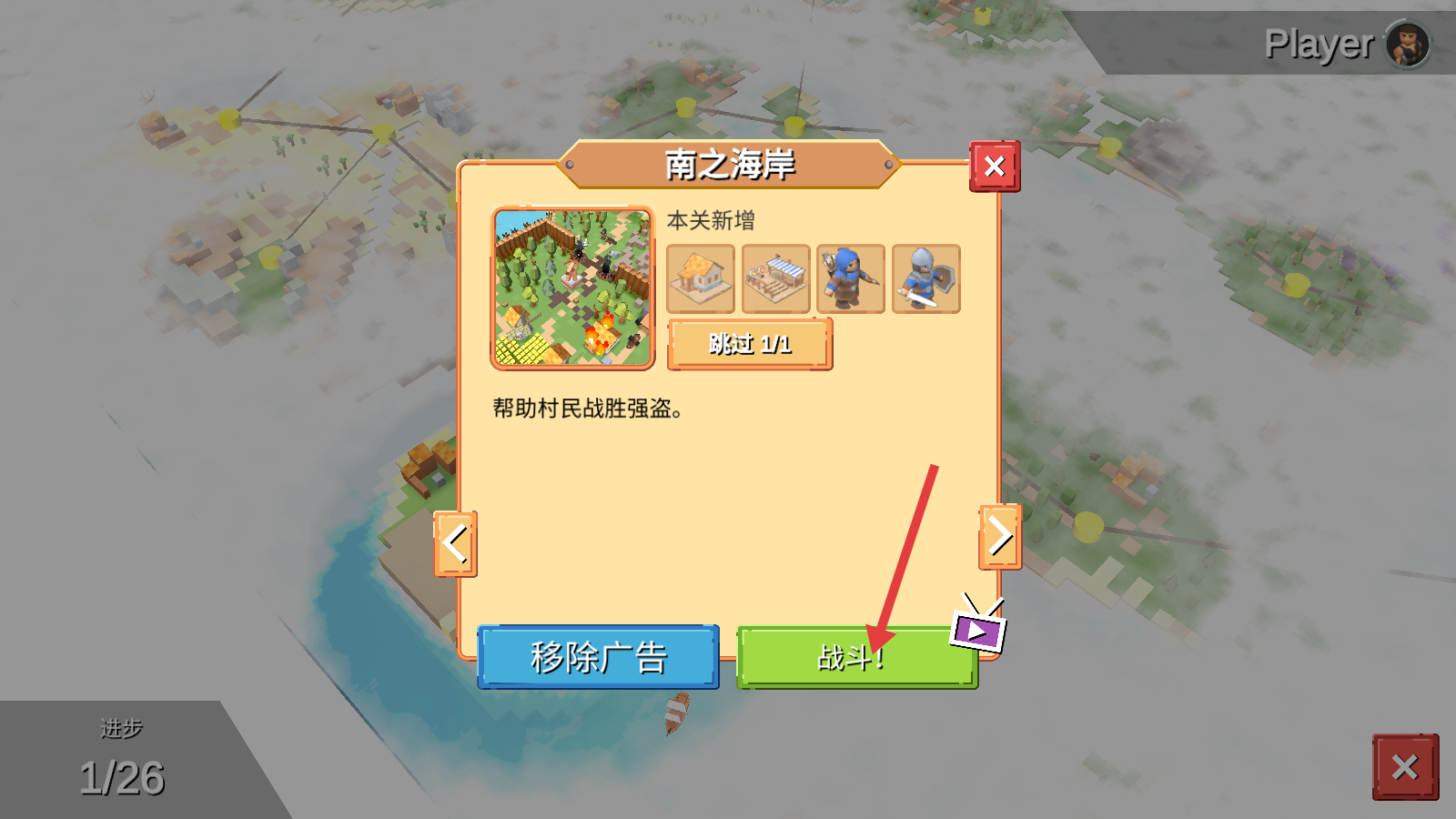 1、进入【南之海岸】关卡,点击【战斗!】,开启帮助村民战胜强盗的冒险,本关新增建筑与士兵,助力防御。